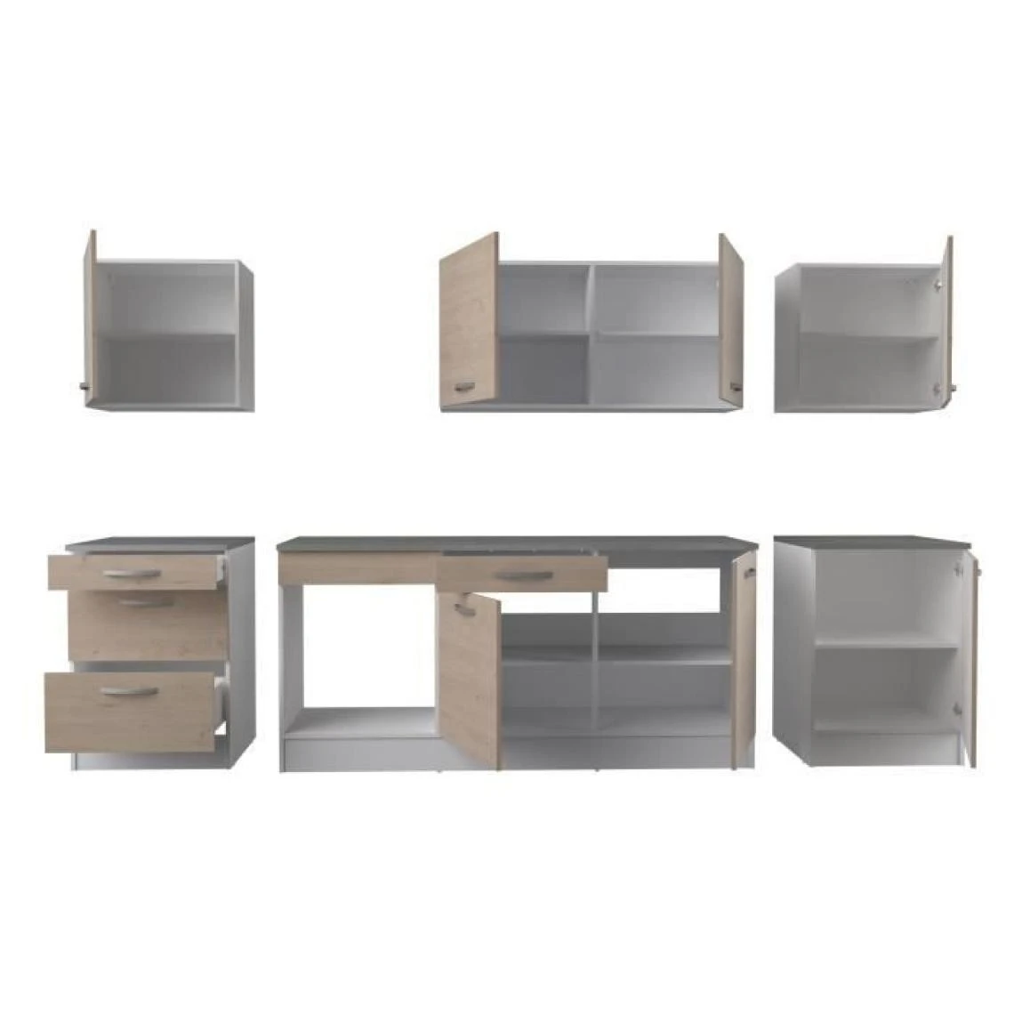 Cuisine complete OSLO Caissons blanc et façades décor chene en panneaux de particules 16mm mélaminé panneaux de fond en fibre 2,5mm plan de travail gris épaisseur 22mm panneau de particules mélaminé et chant mélaminé tiroir avec coulisses a billes Casserolier avec coulisses a galets Charnieres métalliques D26 Poignées plastique finition gris métallisé Fabrication française