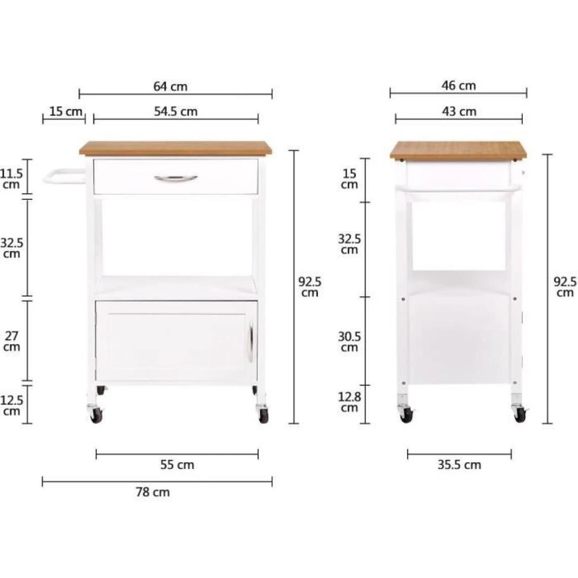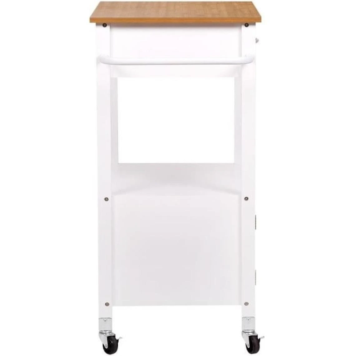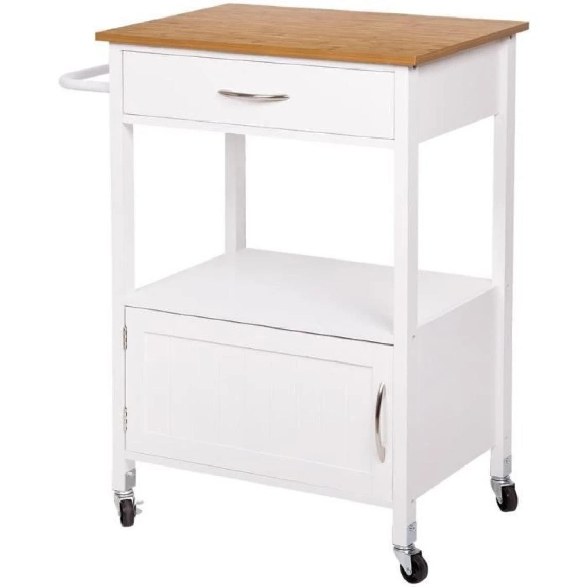 LANDO desserte de cuisine 1 porte 1 tiroir 1 étagere avec top en acier inoxydable, structure en pin et mdf laqué coloris blanc