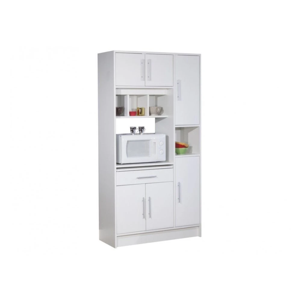 Le buffet de cuisine LOUISE avec différents espaces de rangement : deux tiroirs, trois portes, une niche, et une tablette coulissante.