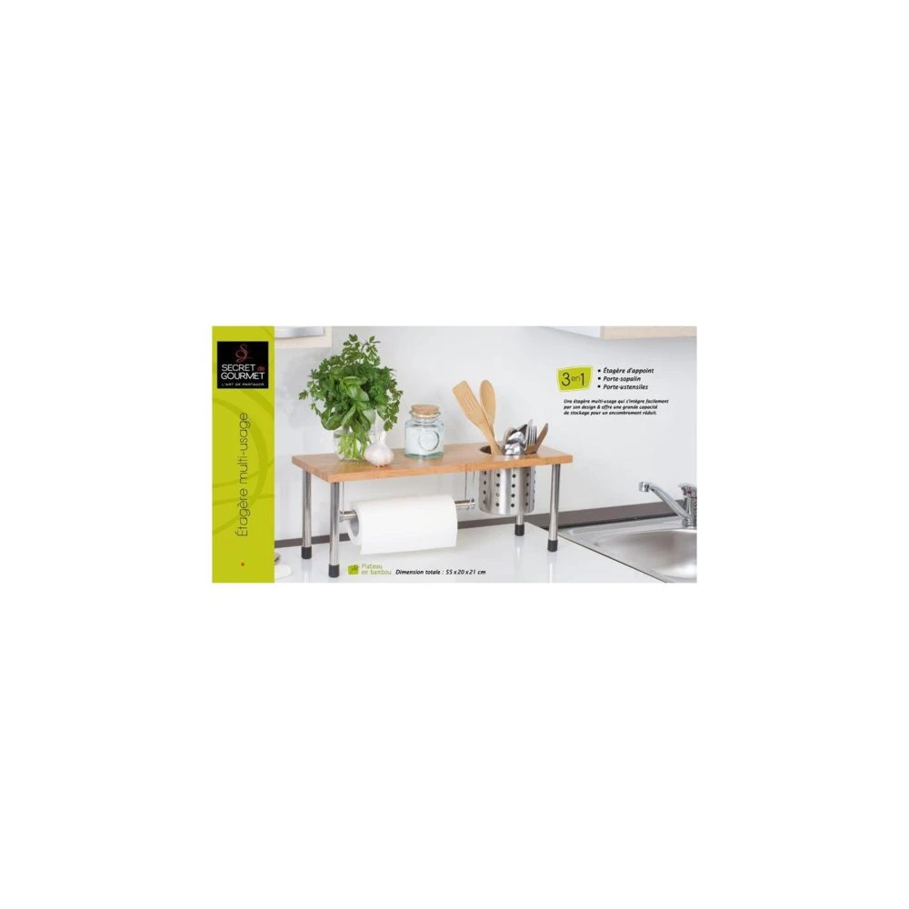 Encore plus d’espace optimisé avec les mêmes ustensiles dans votre cuisine avec cet étagère de rangement très pratique. Il comporte à lui seul un porte ustensile amovible en inox, un porte essuie-tout, et bien sûr un plateau très large en bambou pour votre espace de travail. Ses pieds antidérapants lui offre plus d’adhérence à n’importe quelle surface.