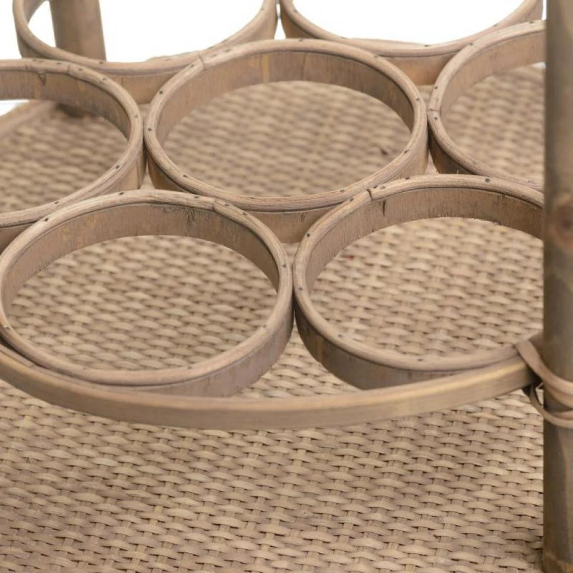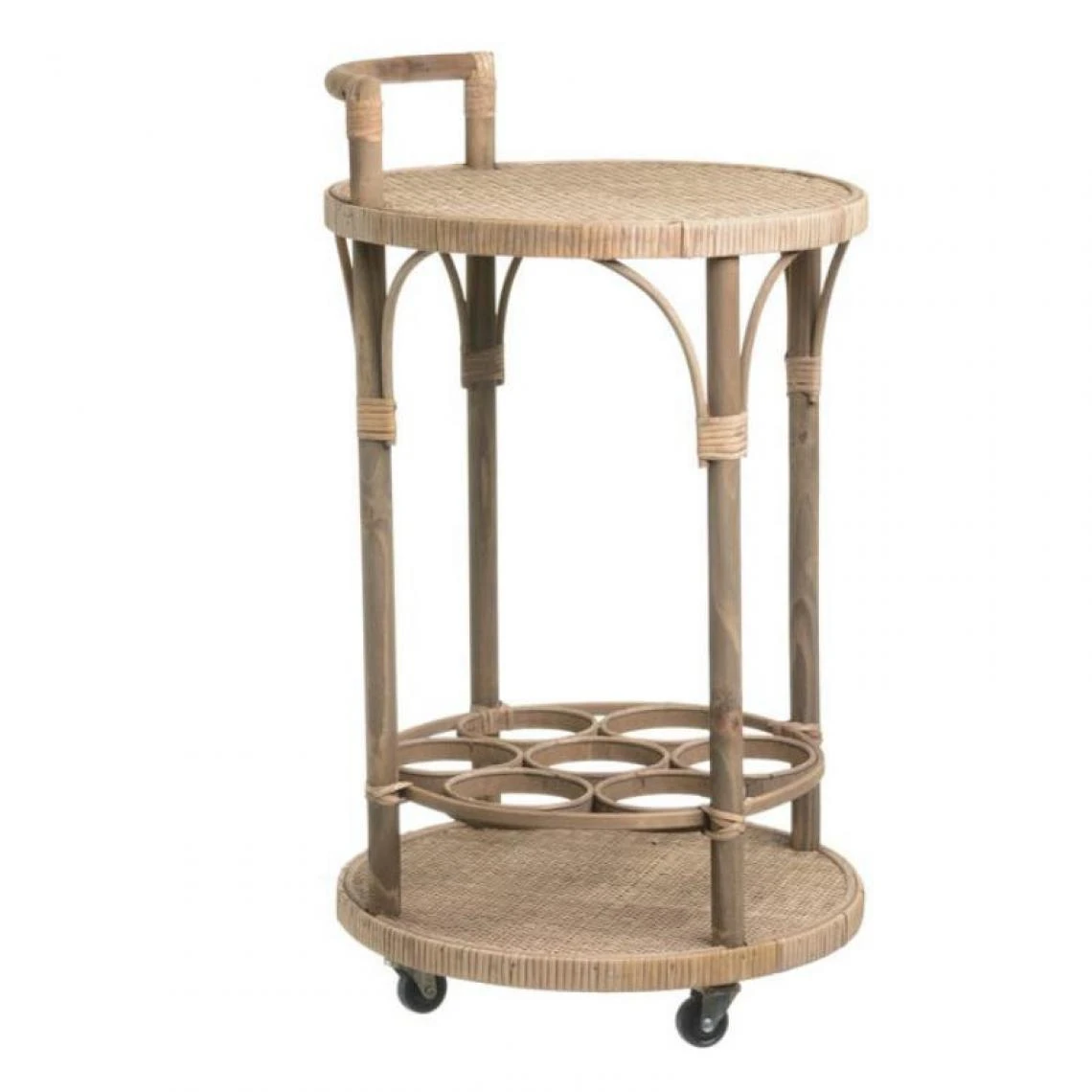 Totalement réalisée en rotin teinte naturelle cette petite table à desservir vous rendra de fiers services, vous pourrez ainsi ranger 6 bouteilles dans les emplacement prévus à cet effet, le plateau supérieur permettra de déposer les verres et biscuits apéritif.