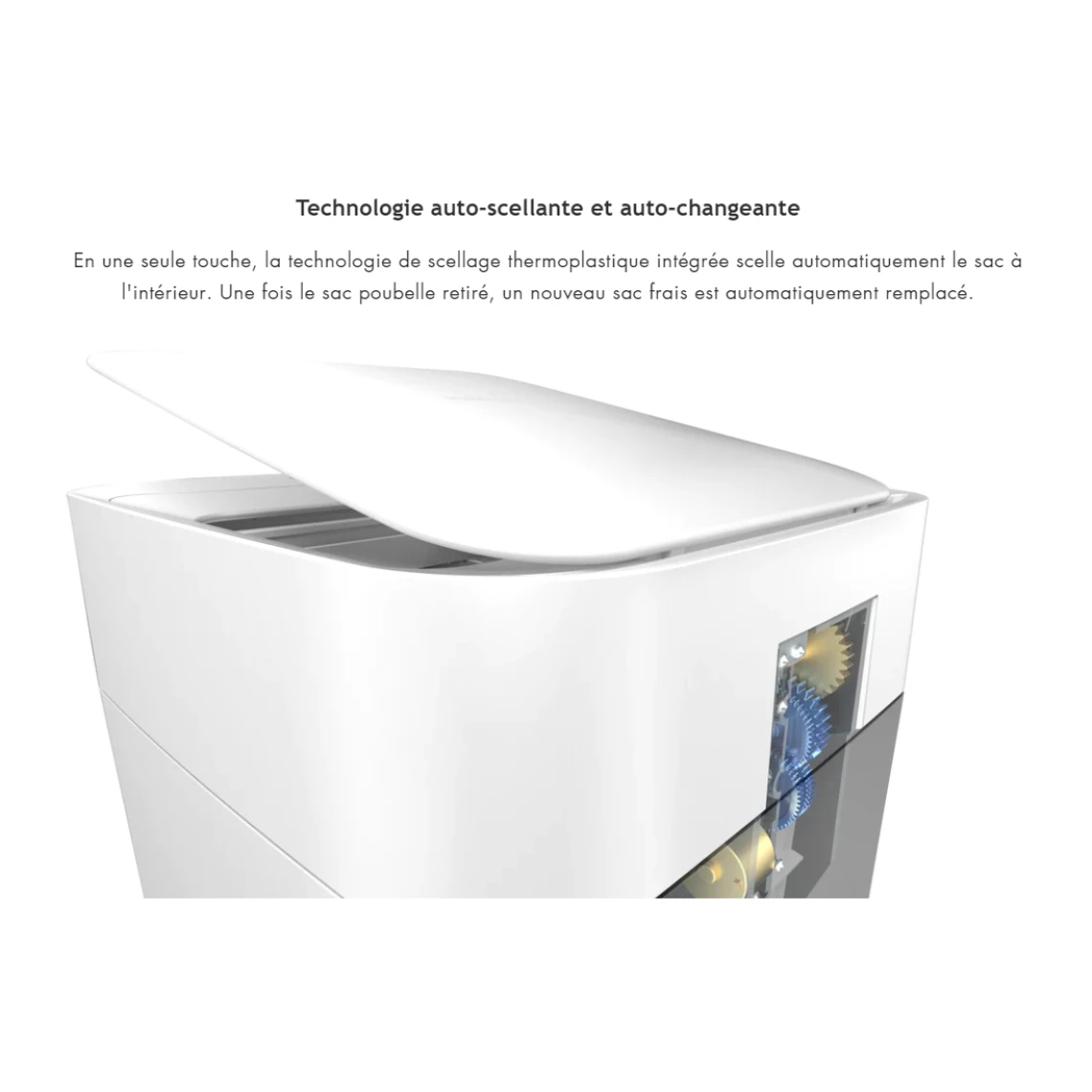En appuyant sur le bouton à l’avant pendant 3 secondes, la poubelle Townew Smart Dustbin scelle automatiquement le sac à ordures à l’intérieur, grâce à sa technologie de scellage thermoplastique. Remplacez également le sac par un neuf.
