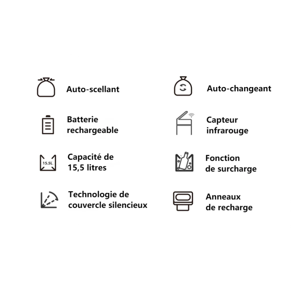 Il ouvre le couvercle automatiquement lorsqu’il détecte un mouvement, scelle le sac lorsqu’il est plein et le remplace de manière autonome par un nouveau.