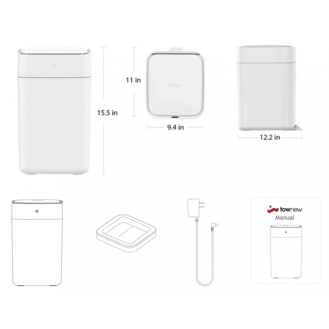 Dans le colis: 1 x Poubelle TOWNEW; 1 x Anneau de recharge amovible (25 sacs-poubelle); 1 x Adaptateur (EU plug or USB charger cable); 1 x Manuel de l’utilisateur et garantie.